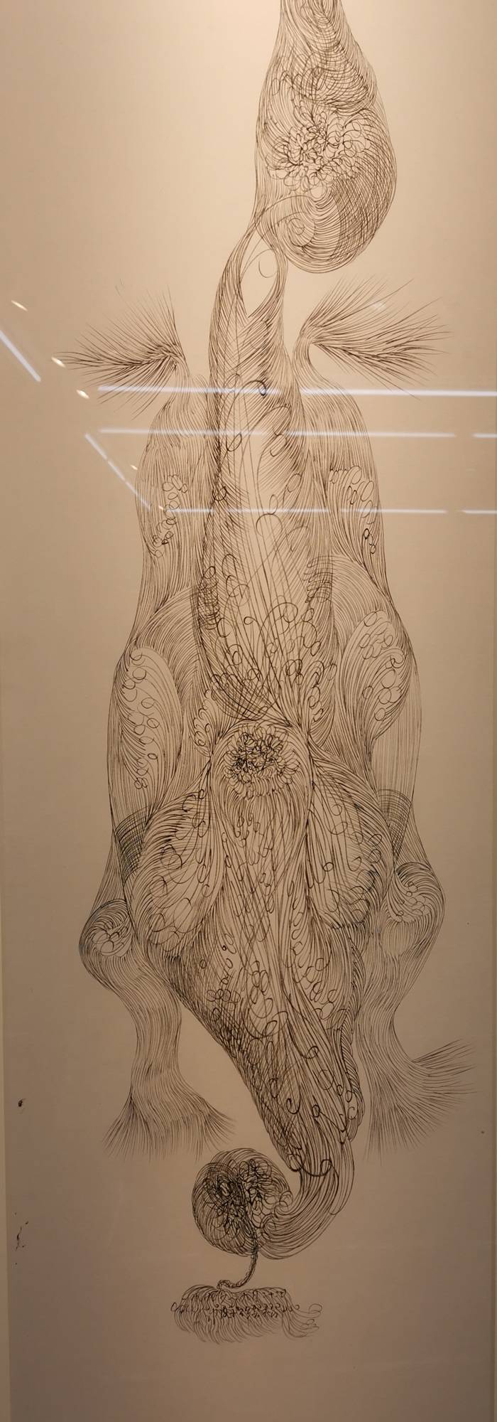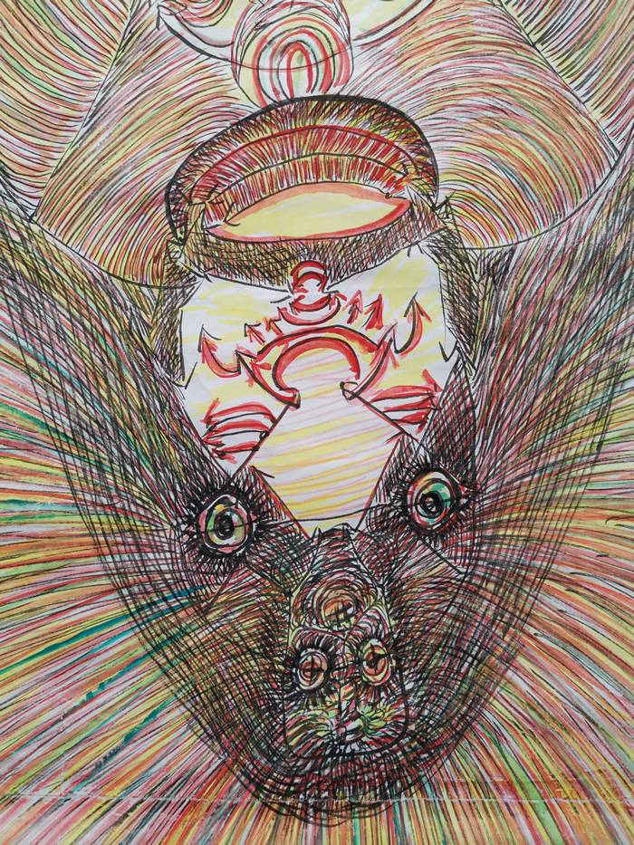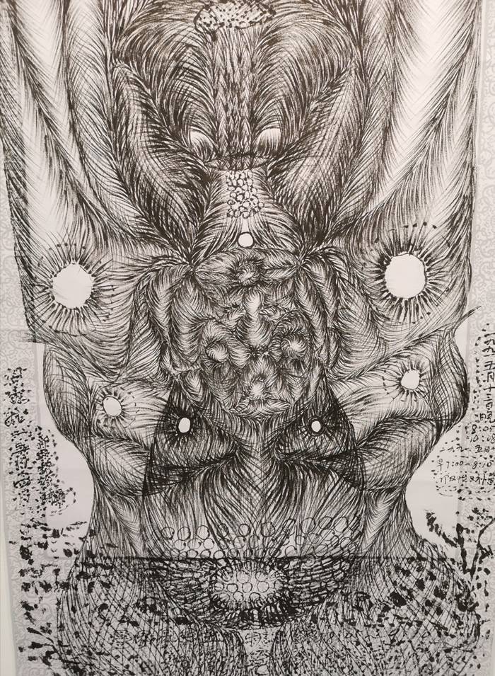 彩色的线条描绘出的稚拙原始的画面有些诡秘,