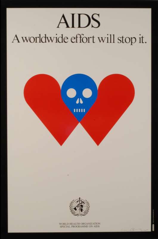格雷泽始终遵守着这个原则,即使“I ♥ NY”系列已经取得了世界性的成功,他却从未从中获利半分——这位艺术家始终坚信设计艺术的社会功用,多年来坚持投身于各种公共事业之中,为各种受歧视的弱势少数群体发声。在1987年,他为世界卫生组织艾滋病特别项目进行标志与海报设计。在画面的正中央,一颗蓝色的头骨位于重叠的两颗红心之间,表情木然,像是死亡将爱情割裂得支离破碎。在海报上方书写着:“艾滋病:世界范围内的努力将使其终结。”克制而悲悯,表达出希望全世界关注艾滋病的希望。在当年引起了世界各地的反思。