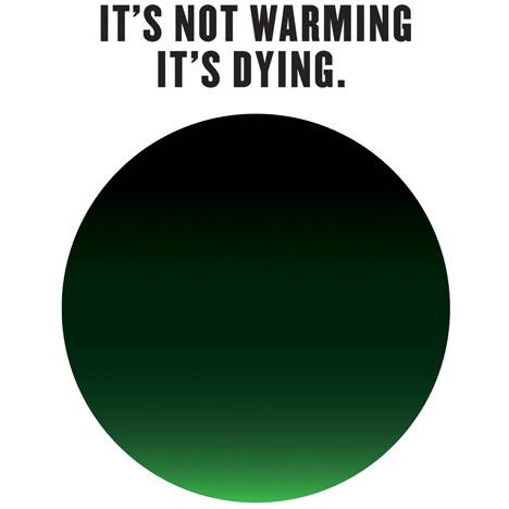 在2014年,他发起了一场号召人们关注气候问题的活动:“这不是全球变暖,而是死亡”(IT’S NOT WARMING.IT’S DYING),设计海报中有一个象征地球的正圆形,它呈现渐变效果,末端仅余一小片鲜绿色,代表这颗星球正在人类的过度活动中慢慢走向衰亡和死寂,用尖锐的视觉效果刺激着人们的视觉神经,对于环保问题也由往常的温和言辞策略中跳脱出来,将其变成一场激烈的抗争。
