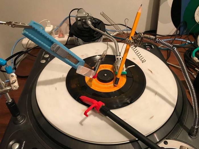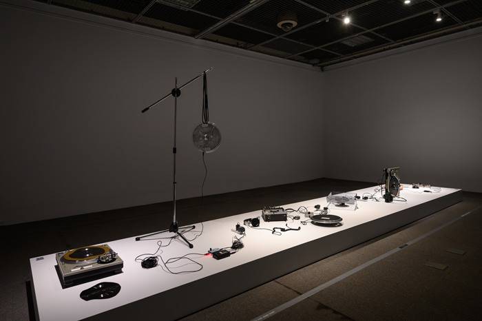 展览现场,这些带有关键词的音乐片段通过唱盘、随身听、混音器、喇叭和扩大器等多个被解构和重组的声响设备播放出来。同样的词语经过多层次的音讯转换变成不易辨识的“声音”,若观众想要完整稳定的听到这261首曲子,必须要连接网络才能实现。艺术家利用声响装置再现了“液态生活”的流动摇摆。