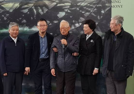 清华艺博常务副馆长杜鹏飞(左2)著名环境学家、原国家环境保护局首任局长曲格平先生(中间)等嘉宾在开幕式上